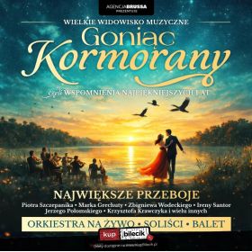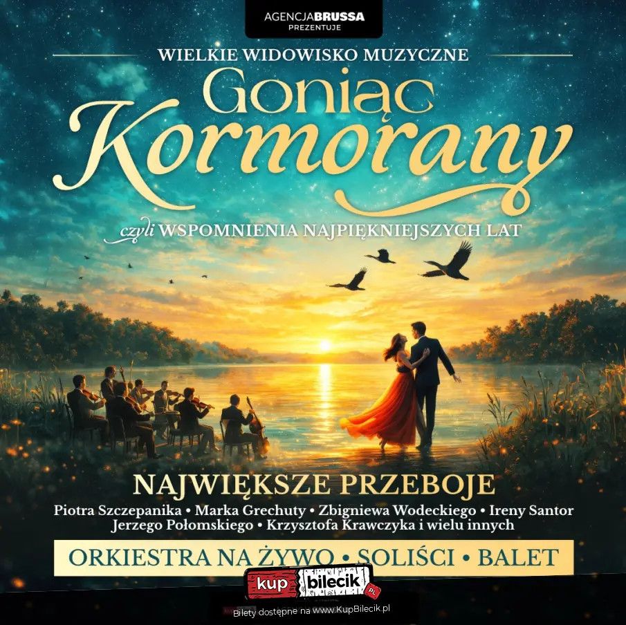 bilety: "Goniąc Kormorany" - koncert, który budzi wspomnienia i wywołuje prawdziwe emocje. Koncert "Goniąc Kormorany" artyści: Różni występującyTo wyjątkowe widowisko muzyczne łączy największe polskie przeboje z elegancką, sceniczną oprawą i orkiestrą na żywo. Usłyszysz utwory, które śpiewała cała Polska - repertuar takich legend jak Piotr Szczepanik, Marek Grechuta, Zbigniew Wodecki, Irena Santor, Jerzy Połomski i Krzysztof Krawczyk - w nowych, dopracowanych aranżacjach. Na scenie: orkiestra, soliści, balet i dopracowana wizualnie oprawa. Widzowie nie tylko słuchają - przeżywają. To wieczór dla tych, którzy tęsknią za melodią, tekstem i klimatem, jakiego dziś już prawie się nie spotyka. Jedno wydarzenie. Dziesiątki ponadczasowych przebojów. Setki emocji. Bilety do nabycia na: KupBilecik.pl |