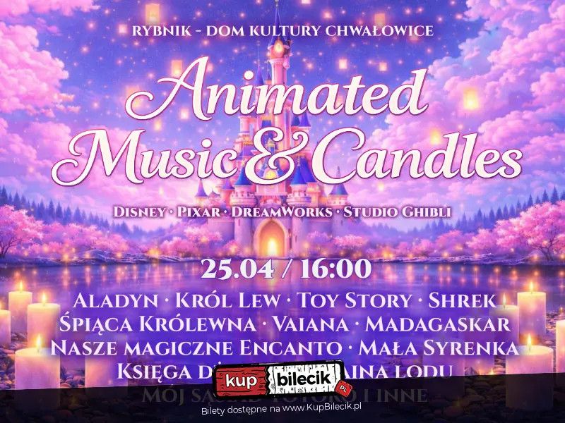 bilety: Magiczny, familijny koncert przy blasku tysiąca świec, który przeniesie Cię do świata najpiękniejszych animacji i bajek. "Animated Music & Candles" to wyjątkowe muzyczne widowisko, w którym kultowe melodie z produkcji Disney, Pixar, DreamWorks oraz Studio Ghibli zabrzmią w świeżych, autorskich aranżacjach na kwartet: fortepian, skrzypce, altówkę i wiolonczelę. Animated Music & Candles artyści: Różni wykonawcyMagiczny, familijny koncert przy blasku tysiąca świec, który przeniesie Cię do świata najpiękniejszych animacji i bajek. "Animated Music & Candles" to wyjątkowe muzyczne widowisko, w którym kultowe melodie z produkcji Disney, Pixar, DreamWorks oraz Studio Ghibli zabrzmią w świeżych, autorskich aranżacjach na kwartet: fortepian, skrzypce, altówkę i wiolonczelę. W programie usłyszysz utwory, które pokochały całe pokolenia: romantyczne i wzruszające tematy z Aladyna, Króla Lwa, Toy Story, Śpiącej Królewny, Vaiany, Shreka, Madagaskar, Mój sąsiad Totoro oraz "Encanto". Nie zabraknie także morskiej przygody z "Małej Syrenki", energii i humoru z "Księgi dżungli", a także przebojów, które znają i nucą zarówno dzieci, jak i dorośli. Wśród nich m.in.: "Hakuna Matata", "Let It Go" (Kraina lodu) oraz "You"ve Got a Friend in Me" (Toy Story) - melodie, które natychmiast wywołują uśmiech i budzą najpiękniejsze wspomnienia. Bilety do nabycia na: KupBilecik.pl |