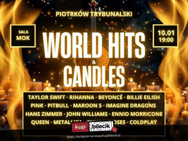 bilety: Niezapomniany magiczny koncert, który zabierze Cię w niezwykłą podróż przez największe hity muzyki rozrywkowej i filmowej. Harmonia dźwięków kwartetu instrumentalnego w składzie fortepianu, skrzypiec, altówki i wiolonczeli ożywi największe przeboje współczesnych gwiazd, takich jak Taylor Swift, Rihanna, Beyoncé, Billie Eilish, Pink, Pitbull, Maroon 5 i Imagine Dragons. Wieczór uświetnią również ponadczasowe dzieła legendarnych artystów, takich jak Queen, Metallica, Guns N" Roses i Coldplay. World Hits & Candles artyści: Muzyka przy blasku świecNiezapomniany magiczny koncert, który zabierze Cię w niezwykłą podróż przez największe hity muzyki rozrywkowej i filmowej. Harmonia dźwięków kwartetu instrumentalnego w składzie fortepianu, skrzypiec, altówki i wiolonczeli ożywi największe przeboje współczesnych gwiazd, takich jak Taylor Swift, Rihanna, Beyoncé, Billie Eilish, Pink, Pitbull, Maroon 5, Andrea Bocceli i Imagine Dragons. Wieczór uświetnią również ponadczasowe dzieła legendarnych artystów, takich jak Queen, Metallica, Guns N’ Roses i Coldplay. Bilety do nabycia na: KupBilecik.pl |